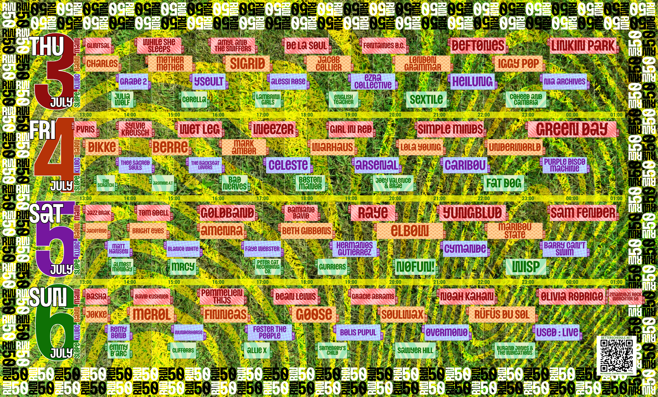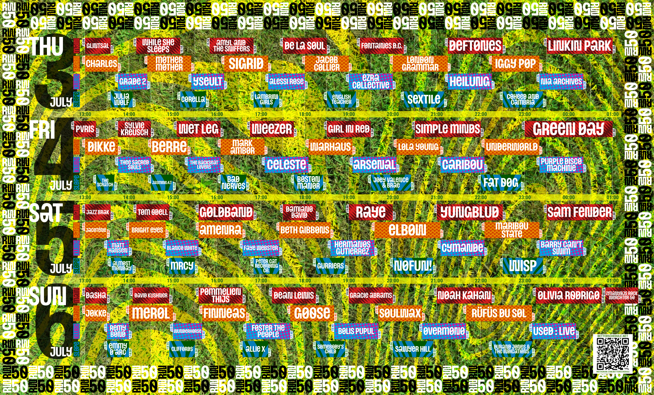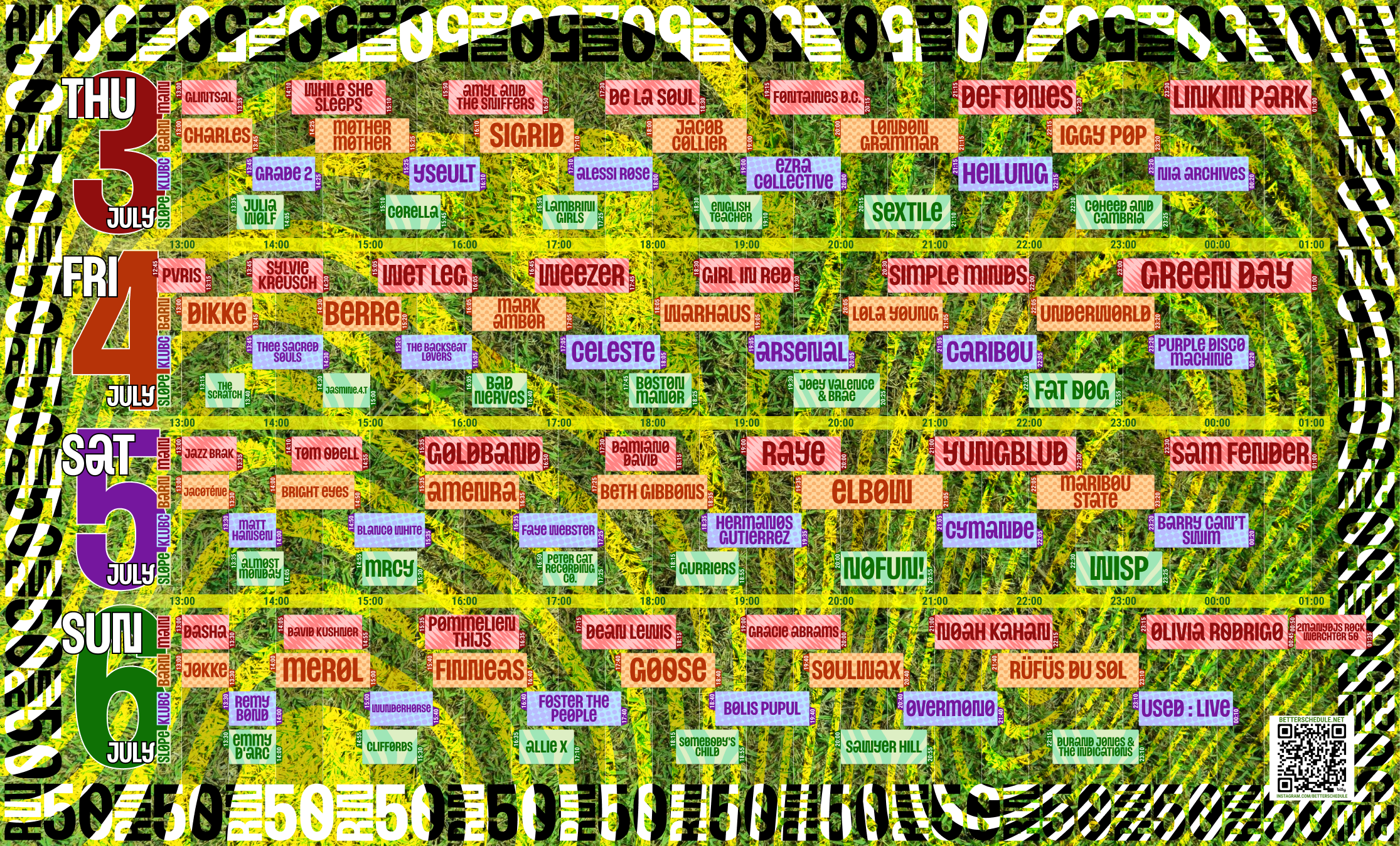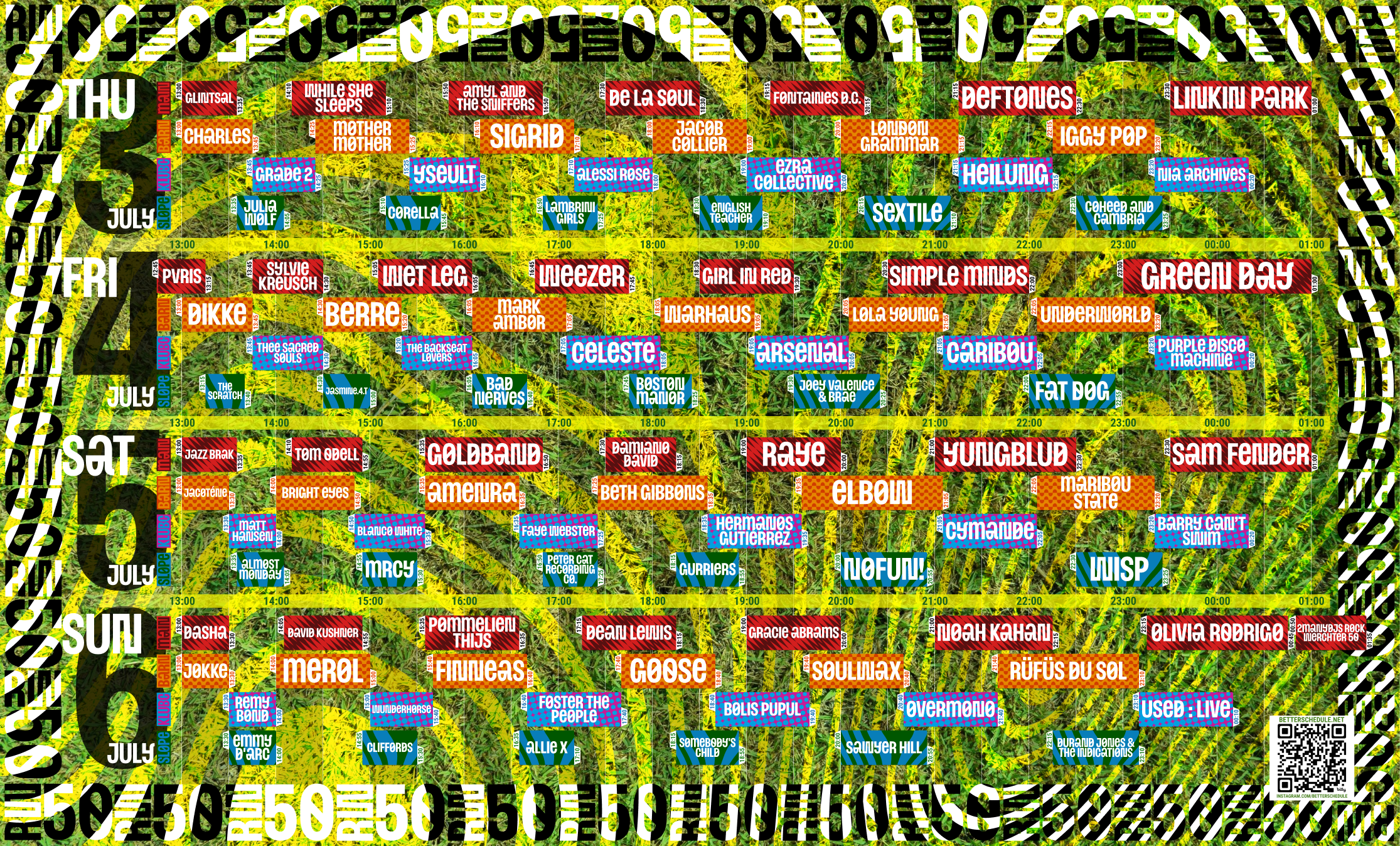 Grass design with white blocks and festival lineup for a clean look.